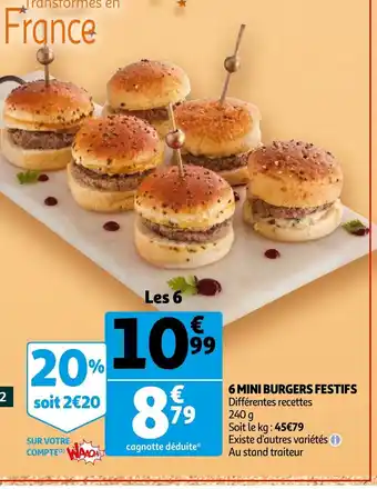 | 6 Mini Burgers Festifs | Auchan | 10,99 € | 8,79 € | 2,20 € Réduction | 28 décembre 2021 | 03 janvier 2022 | |