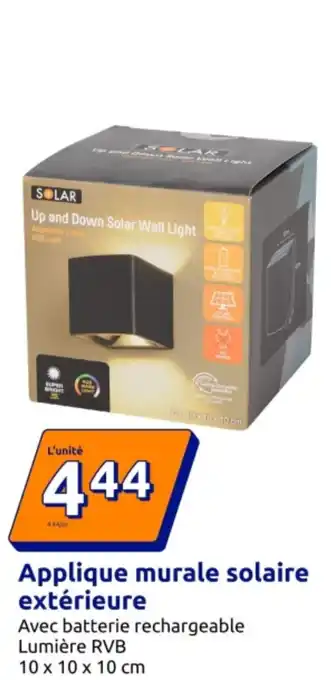 En plus de l'offre Applique murale solaire extérieure, Action propose une large gamme de produits. Consultez le Catalogue Action hebdomadaire pour découvrir les meilleures offres et promotions. En plus de Applique murale solaire extérieure, il y a aussi : Applique murale solaire diamant, Dim - applique extérieure led inspire & Suspension extérieure solaire myha.