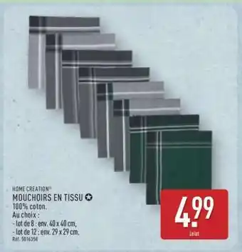 En plus de l'offre MOUCHOIRS EN TISSU, ALDI propose une large gamme de produits. Consultez le Catalogue ALDI hebdomadaire pour découvrir les meilleures offres et promotions. En plus de MOUCHOIRS EN TISSU, il y a aussi : HOME CREATION Mouchoirs en tissu, 6 mouchoirs & 6 mouchoirs.