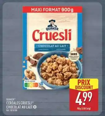 Actuellement en offre chez ALDI : QUAKER CÉRÉALES CRUESLI CHOCOLAT AU LAIT ✅ Valable du 6-01 au 12-01.