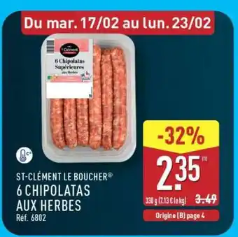 Actuellement en offre chez ALDI : ST-CLÉMENT LE BOUCHER 6 CHIPOLATAS AUX HERBES ✅ Valable du 17-02 au 23-02.