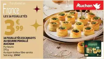Actuellement en offre chez Auchan Supermarché : Auchan - 16 feuilletés escargots au beurre persille ✅ Valable du 16-12 au 31-12.