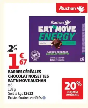 AUCHAN Barres céréales chocolat noisettes eat move energy 138 g
