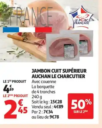 Actuellement en offre chez Auchan Supermarché : AUCHAN LE TRAITEUR Jambon cuit supérieur ✅ Valable du 17-03 au 21-03.