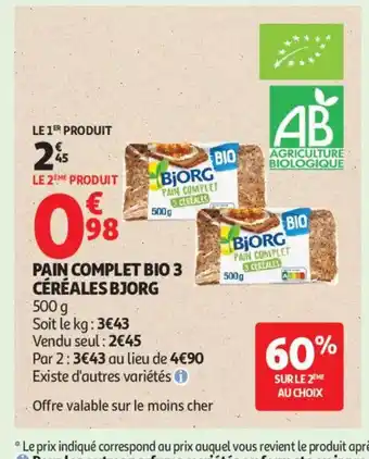 Actuellement en offre chez Auchan Supermarché : BJORG Pain complet bio 3 céréales ✅ Valable du 24-02 au 7-03.