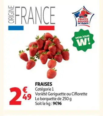 Quand Fraises sera-t-elle en promotion ? Ou encore : "Est-ce que Fraises sera en promotion la semaine prochaine ?" C’est une question fréquente. Beaucoup de consommateurs établissent leur liste de courses à l’avance. Pour cette raison, nous mettons en ligne les informations sur les promos à venir dès qu’elles sont connues. Cela vous permet de planifier vos achats et de faire de bonnes affaires. Consultez régulièrement notre site pour savoir si une nouvelle promo sur Fraises arrive bientôt chez Auchan Supermarché.Questions fréquemment posées au sujet de Fraises