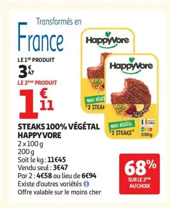 Actuellement en offre chez Auchan Supermarché : HAPPY VORE Steaks 100% végétal ✅ Valable du 2-01 au 10-01.