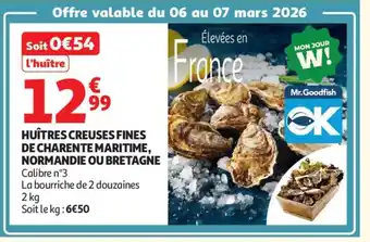 Actuellement en offre chez Auchan Supermarché : Huîtres creuses fines de charente maritime, normandie ou bretagne ✅ Valable du 3-03 au 7-03.