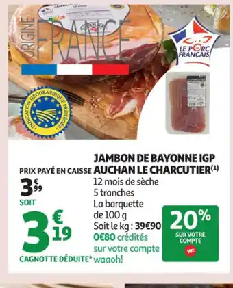Actuellement en offre chez Auchan Supermarché : Jambon de bayonne igp auchan le charcutier ✅ Valable du 16-12 au 24-12.