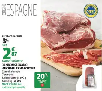 Actuellement en offre chez Auchan Supermarché : Jambon serrano auchan le charcutier ✅ Valable du 13-01 au 24-01.