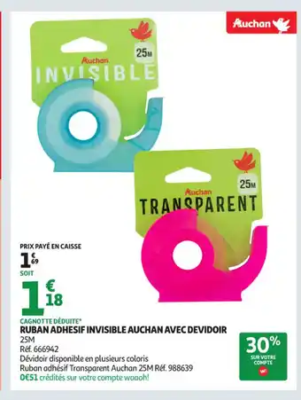 Actuellement en offre chez Auchan Supermarché : Ruban adhesif invisible auchan avec devidoir ✅ Valable du 16-12 au 24-12.