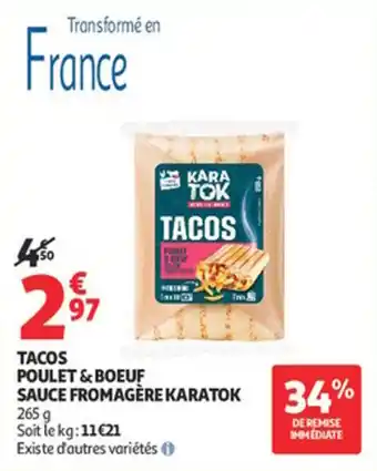 Actuellement en offre chez Auchan Supermarché : Tacos poulet & boeuf sauce fromagère karatok ✅ Valable du 13-01 au 24-01.