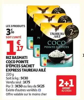 Actuellement en offre chez Auchan Supermarché : TAUREAU AILÉ Riz basmati coco pointe d'épices sachet express ✅ Valable du 24-02 au 7-03.
