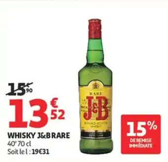 En plus de l'offre Whisky j&brare, Auchan Supermarché propose une large gamme de produits. Consultez le Catalogue Auchan Supermarché hebdomadaire pour découvrir les meilleures offres et promotions. En plus de Whisky j&brare, il y a aussi : Whisky Ballantine's, Ballantine's whisky & J&b - whisky blended rare.