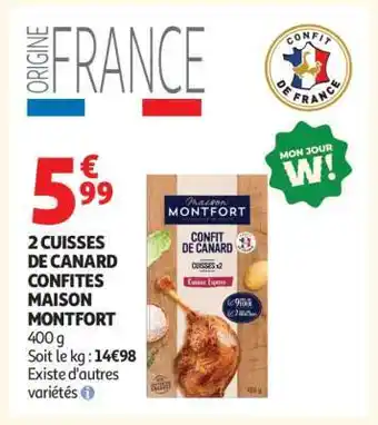 Actuellement en offre chez Auchan : 2 Cuisses De Canard Confites Maison Montfort ✅ Valable du 28-04 au 10-05.