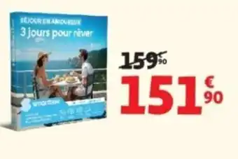 L'offre est disponible dans plusieurs magasins, vérifiez tous les produits pour obtenir le 3 jours pour rever le moins cher. Si vous souhaitez savoir si l'article est en vente avec une plus grosse remise dans un autre magasin, consultez la catégorie 'Supermarché'. Ces offres pourraient aussi vous intéresser : Séjour en amoureux 3 jours pour réver, Séjour en amoureux 3 jours pour rêver & Radis de 18 jours.