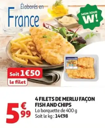 En plus de l'offre 4 filets de merlu façon fish and chips, Auchan propose une large gamme de produits. Consultez le Catalogue Auchan hebdomadaire pour découvrir les meilleures offres et promotions. En plus de 4 filets de merlu façon fish and chips, il y a aussi : 4 filets de merlu façon fish and chips auchan le poissonier, Auchan - 4 filets de merlu façon fish and chips le poissonier & Filets de colin (lieu) façon fish and chips.