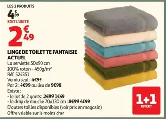 Actuellement en offre chez Auchan : ACTUEL Linge de toilette fantaisie ✅ Valable du 17-02 au 1-03.