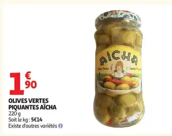 Actuellement en offre chez Auchan : AÏCHA Olives vertes piquantes ✅ Valable du 3-02 au 1-03.