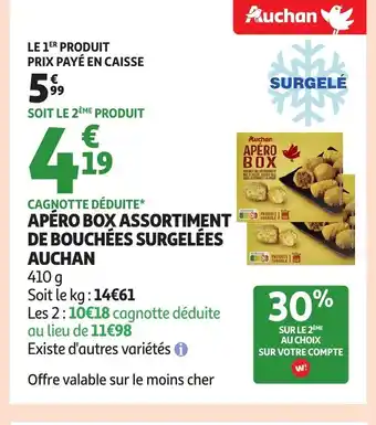 Actuellement en offre chez Auchan : AUCHAN Apéro box assortiment de bouchées surgelées ✅ Valable du 6-01 au 18-01.