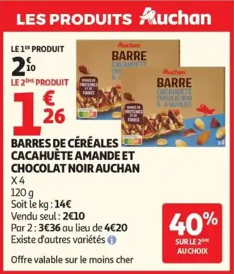 Offre Barres de céréales cacahuète amande et chocolat noir auchan chez Auchan