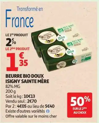 Actuellement en offre chez Auchan : BEURRE BIO DOUX ISIGNY SAINTE MÈRE ✅ Valable du 8-04 au 18-04.
