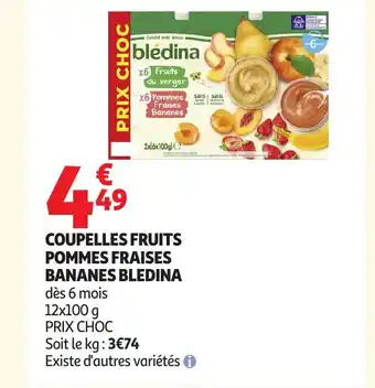 Actuellement en offre chez Auchan : BLEDINA Coupelles fruits pommes fraises bananes ✅ Valable du 6-01 au 18-01.