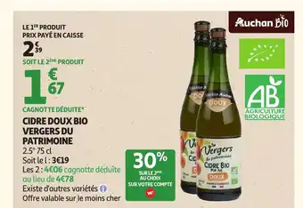 Actuellement en offre chez Auchan : Cidre doux bio vergers du patrimoine ✅ Valable du 2-01 au 11-01.
