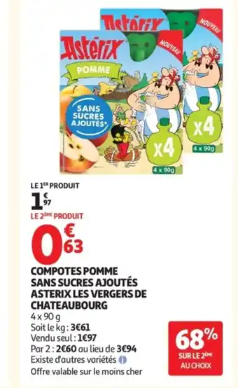 Actuellement en offre chez Auchan : Compotes pomme sans sucres ajoutés asterix les vergers de chateaubourg ✅ Valable du 24-02 au 8-03.