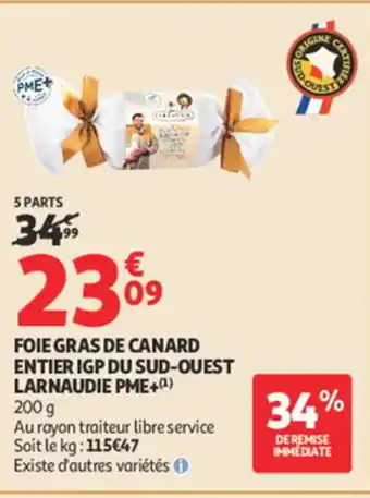 Actuellement en offre chez Auchan : Foie gras de canard entier igp du sud-ouest larnaudie pme+ ✅ Valable du 16-12 au 31-12.