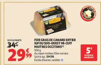 Actuellement en offre chez Auchan : Foie gras de canard entier igp du sud-ouest mi-cuit maitres occitans ✅ Valable du 16-12 au 31-12.