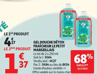 Le prix de l'offre Gel douche détox fraîcheur le petit marseillais se trouve également en haut de la page, ainsi que la date à laquelle l'offre est disponible. Vous pouvez également vérifier les prix dans le Catalogue Auchan actuel ou sur le site Internet de Auchan. Les offres vous permettent d'acheter les produits Auchan au prix le plus bas.