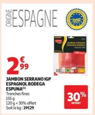 Actuellement en offre chez Auchan : JAMBON SERRANO IGP ESPAGNOL BODEGA ESPUNA ✅ Valable du 8-04 au 19-04.
