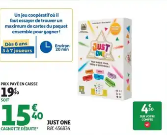L'offre est disponible dans plusieurs magasins, vérifiez tous les produits pour obtenir le Just one le moins cher. Si vous souhaitez savoir si l'article est en vente avec une plus grosse remise dans un autre magasin, consultez la catégorie 'Supermarché'. Ces offres pourraient aussi vous intéresser : ASMODEE Just One, SCOOTER ONE & Coffret pour homme just man.