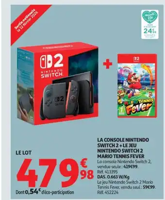 Le prix de l'offre La console nintendo switch 2+ le jeu nintendo switch 2 mario tennis fever se trouve également en haut de la page, ainsi que la date à laquelle l'offre est disponible. Vous pouvez également vérifier les prix dans le Catalogue Auchan actuel ou sur le site Internet de Auchan. Les offres vous permettent d'acheter les produits Auchan au prix le plus bas.