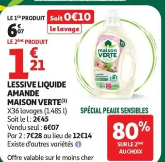 Actuellement en offre chez Auchan : MAISON VERT Lessive liquide amande ✅ Valable du 16-12 au 24-12.
