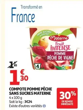 Actuellement en offre chez Auchan : MATERNE Compote pomme pêche sans sucres ✅ Valable du 17-02 au 1-03.