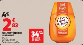 Actuellement en offre chez Auchan : Miel fruité liquide lune de miel ✅ Valable du 20-01 au 1-02.