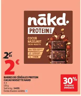 Actuellement en offre chez Auchan : NAKD Barres de céréales protein cacao noisette ✅ Valable du 10-02 au 22-02.