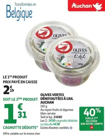 Actuellement en offre chez Auchan : Olives vertes dénoyautées à l'ail auchan ✅ Valable du 20-01 au 1-02.