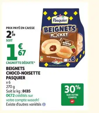 Actuellement en offre chez Auchan : PASQUIER Beignets choco-noisette ✅ Valable du 10-02 au 22-02.