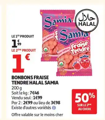 Actuellement en offre chez Auchan : SAMIA Bonbons fraise tendre halal ✅ Valable du 3-02 au 1-03.