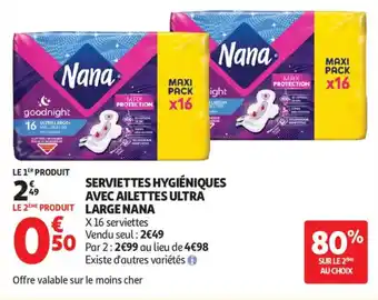 Actuellement en offre chez Auchan : SERVIETTES HYGIÉNIQUES AVEC AILETTES ULTRA LARGE NANA ✅ Valable du 21-04 au 3-05.