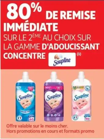 Actuellement en offre chez Auchan : SUR LE 2ÈME AU CHOIX SUR LA GAMME D'ADOUCISSANT CONCENTRE Soupline ✅ Valable du 26-12 au 6-01.