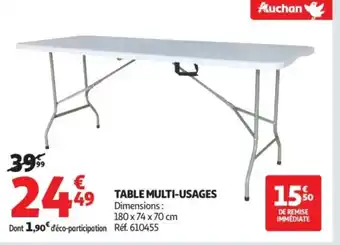 Actuellement, Table multi-usages est en promotion chez Auchan. Toutes les informations utiles comme le prix, les conditions et la durée de validité sont affichées sur cette page. Consultez également les promotions similaires pour Table multi-usages, afin de faire le meilleur choix. La promo Table multi-usages est valable du 16-12-2025 au 24-12-2025. Si elle est expirée, regardez les autres offres équivalentes. Vous pouvez aussi suivre cette catégorie de produit pour être alerté lorsqu’une nouvelle promotion Table multi-usages apparaît chez Auchan.Questions fréquemment posées au sujet de Table multi-usages