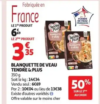 En plus de l'offre TENDRE & PLUS Blanquette de veau, Auchan propose une large gamme de produits. Consultez le Catalogue Auchan hebdomadaire pour découvrir les meilleures offres et promotions. En plus de TENDRE & PLUS Blanquette de veau, il y a aussi : Blanquette de veau, Blanquette de veau et riz & Blanquette de veau le ou langue de boeuf u.