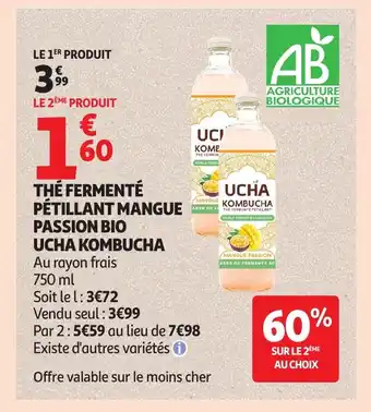 UCHA KOMBUCHA Thé fermenté pétillant mangue passion bio : offres et promos Auchan à découvrir
