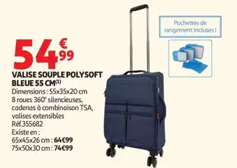 Actuellement en offre chez Auchan : VALISE SOUPLE POLYSOFT BLEUE 55 CM ✅ Valable du 14-04 au 26-04.