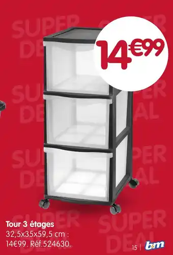 En plus de l'offre Tour 3 étages, b&m propose une large gamme de produits. Consultez le Catalogue b&m hebdomadaire pour découvrir les meilleures offres et promotions. En plus de Tour 3 étages, il y a aussi : Organisateur 2 étages, Resserre 3 étages & Penderie avec etages.
