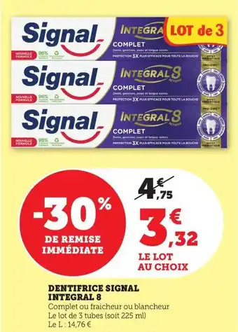 L'offre est disponible dans plusieurs magasins, vérifiez tous les produits pour obtenir le Dentifrice signal integral 8 le moins cher. Si vous souhaitez savoir si l'article est en vente avec une plus grosse remise dans un autre magasin, consultez la catégorie 'Supermarché'. Ces offres pourraient aussi vous intéresser : Signal - dentifrice intégral 8, Signal - dentifrice integral 8 & Signal - dentifrice intégral 8.